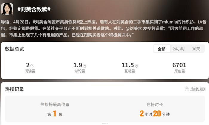 On the evening of April 28th, actress Liu Meihan released an apology video, stating that due to previous work oversights, several faulty products appeared at the market, and she had actively resolved the issues with each purchaser1. Subsequently, the hashtag “#Liu Meihan Apologizes” topped the 热搜 list1.