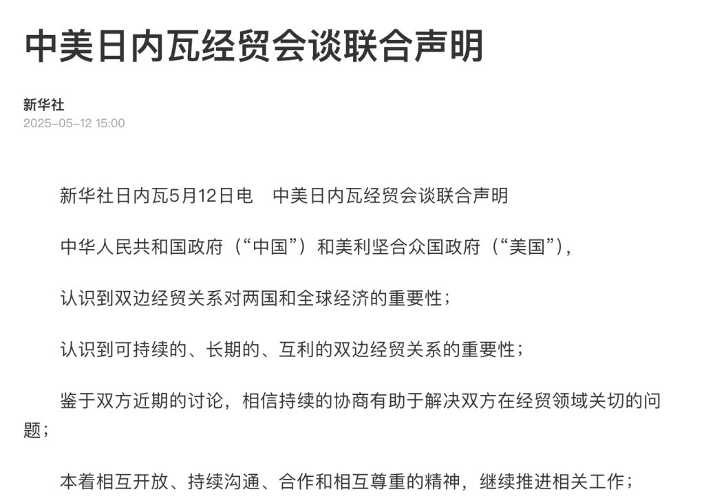 Geneva, May 12th – Joint Statement of the China-US Economic and Trade Talks in Geneva