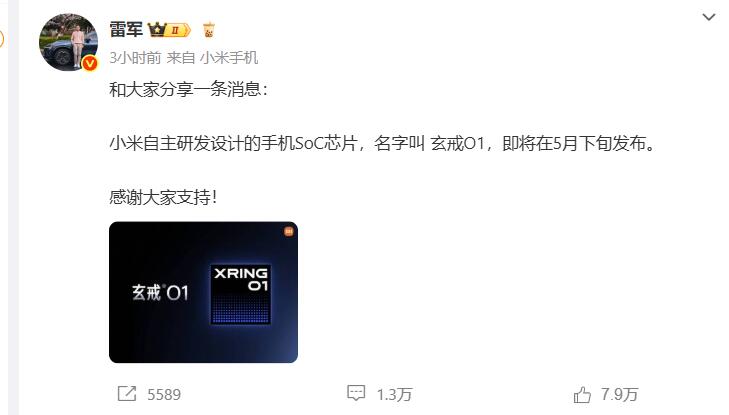 On the evening of May 15, Lei Jun, the founder, chairman and CEO of Xiaomi Group, officially announced through social media: “I’d like to share a piece of news with you: Xiaomi’s self-developed and designed mobile phone SoC chip, named Xuanjie O1, will be released in late May. Thank you all for your support!”