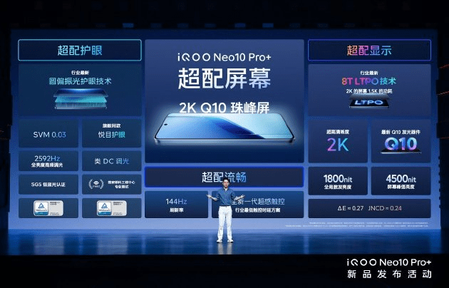The Super-equipped Dual-Core God of War also has a super-equipped screen. The iQOO Neo10 Pro+ is equipped with the same 6.82-inch 2K Q10 Zhufeng screen as the flagship model, with a PPI as high as 510, making the picture very delicate. It also has the currently better 1800nit global excitation brightness and 4500nit local peak brightness among 2K screens, with a leading display effect in the industry. It has the “circularly polarized light technology”, which can make the screen light as soft as natural light, effectively reducing the visual fatigue and dry eye symptoms caused by users watching the screen, achieving hardware-level true eye protection. The screen supports two options of 2592Hz full-brightness high-frequency dimming and class DC dimming, achieving a low flicker of as low as 0.03 SVM in the industry, and is equipped with the same “Eye-comforting Protection” technology as the flagship model, realizing all-day, all-scene, and all-people eye protection.