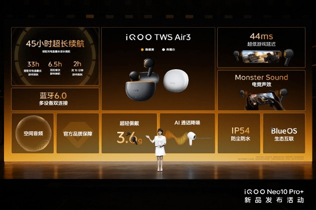 The iQOO TWS Air3 has two color schemes: “Hidden Shine Yellow” and “Running Thunder White”. The single earphone weighs only 3.6g, making it light and comfortable to wear. It supports IP54, allowing for more secure use. It supports the LC3 audio encoding, achieving a full-link gaming latency of 44ms and an earphone-end latency of 15ms. The earphone can be used for 10 hours of listening to music at a time, 6.5 hours of gaming at a time, and with the earphone case, it can achieve a music playback battery life of up to 45 hours. Charging for 10 minutes allows you to play games continuously for 2 hours with your phone, truly achieving fast charging and long playing time. It has a 12mm high-resolution composite sound unit, with spatial audio, Monster Sound e-sports sound effect, and DeepX 3.0 stereo sound effect, bringing a better listening experience whether listening to music or playing games. It supports Bluetooth 6.0 multi-device dual connection and wireless karaoke ear return, and is integrated into the BlueOS ecosystem, achieving intelligent connection and communication with devices in the ecosystem. It is an excellent partner for vivo / iQOO mobile phones.