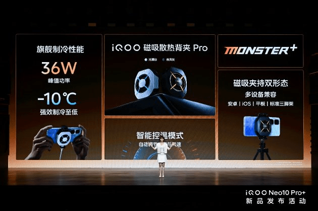 The iQOO Magnetic Cooling Back Clip Pro has two color schemes: “Gale Grey” and “Light Frost White”, equipped with a cool colorful Halo light effect. It supports both magnetic and clamping forms, is compatible with multiple types of devices and standard tripods, suitable for more scenarios, and more convenient for live broadcasting. It can achieve a maximum power of 36W and a steady-state power of 30W, a super-large power flagship-level cooling, which can quickly cool down to as low as -10℃, and only takes 26 seconds to drop to 0℃. It can also activate the Monster+ mode of iQOO mobile phones and tablets, further releasing outstanding performance, allowing high-power consumption games to run stably for a long time. It adopts an intelligent frequency conversion design, maintaining an appropriate temperature for the phone while saving power consumption and ensuring smooth gaming, and avoiding the generation of condensed water inside the phone.