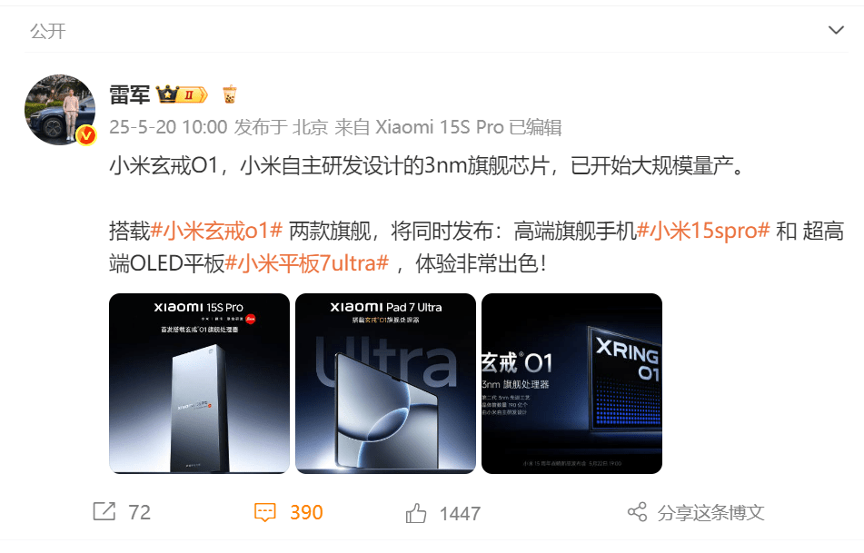 On May 20, Lei Jun, Chairman of Xiaomi Group, announced on Weibo that the Xiaomi Xuanjie O1, the company’s independently developed 3nm flagship chip, has entered mass production. On May 19, Lei Jun, the founder of Xiaomi Group, posted on Weibo, reviewing Xiaomi’s “chip-making journey” and revealing that the Xiaomi Xuanjie O1 uses the second-generation 3nm process technology, which is much more advanced than the previously speculated 7nm and 4nm.