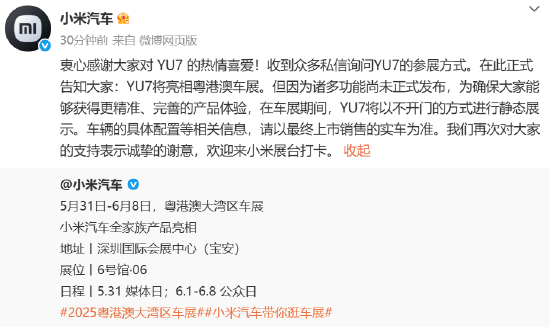Sina Technology News, afternoon of May 26, 2025. Xiaomi Car announced on a social media platform in the afternoon that in response to numerous private messages inquiring about the way YU7 would participate in the exhibition, YU7 will make an appearance at the Guangdong-Hong Kong-Macao Greater Bay Area Auto Show. However, due to many functions not being officially released yet, during the auto show, YU7 will be displayed statically with its doors remaining closed.