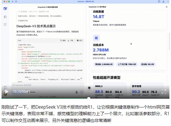 Some netizens who conducted evaluations said that they felt the model’s comprehension ability has been elevated to a new level. For example, in the part of activating parameters, the R1 can create interactive animations for demonstration, and the logic of key information is also very clear.